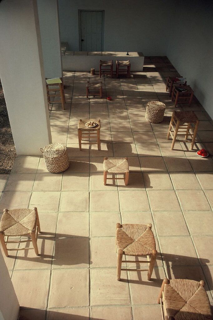 Geometría y Sensualidad: Un Hogar Pensado para Ser Vivido Aunque profundamente respetuosa con lo natural, la propuesta de Rudofsky no renuncia a la intelectualización del espacio. Una retícula de 2,75 metros ordena el territorio, la casa y hasta la zona de la piscina, imponiendo una geometría que, paradójicamente, realza la esencia rural del lugar. Este orden es el contrapunto a un programa interior diseñado desde una perspectiva profundamente personal y sensual. “La Casa”, como la bautizaron Bernard y Berta, acoge espacios mínimos –dormitorio, estar, cocina-comedor y un pequeño estudio–, resultado de un análisis íntimo de sus hábitos y su forma de entender el confort, priorizando la experiencia sensorial sobre la pura funcionalidad.